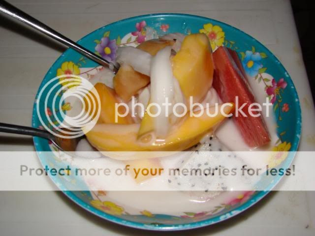 Món kem trái cây gồm một viên kem dừa với dừa nạo và hoa quả tươi ăn cũng rất thơm ngon.